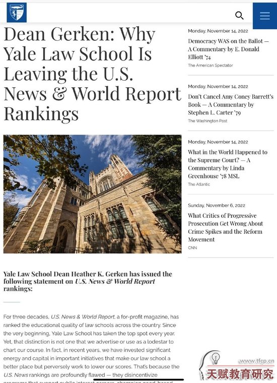 美國當?shù)貢r間11月16日,耶魯大學法學院突然宣布“他們將退出U.S.News法學院排名”。沒過多久,哈佛大學法學院也緊隨其后,宣布“將不在參加U.S.News對頂級法學院的年度排名”。